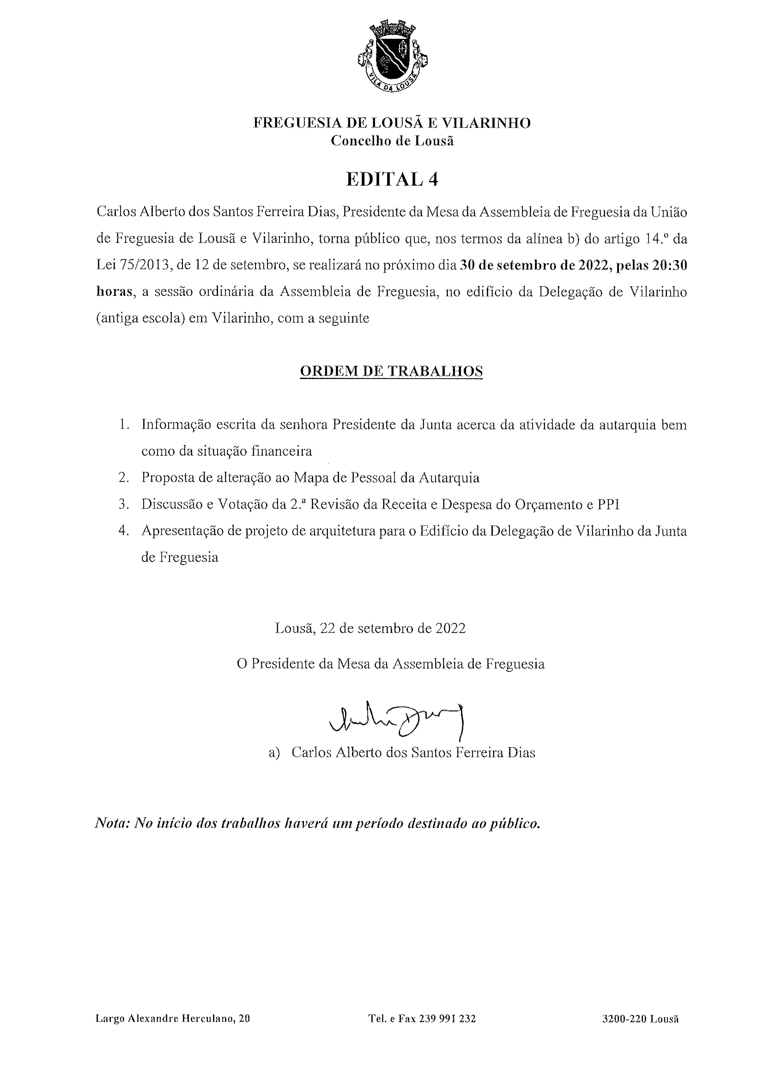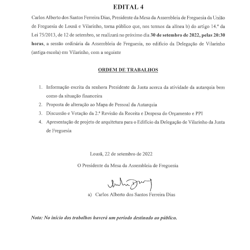 Published 22 Setembro, 2022 Edital 4 – Sessão Ordinária da Assembleia de Freguesia 30 de setembro 2022 VERSÃO PDF